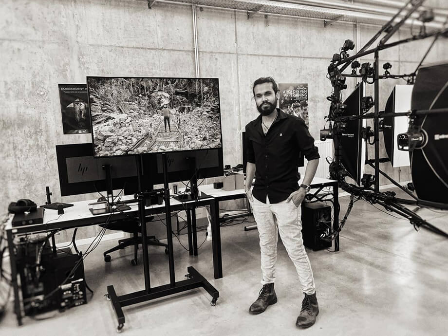 Technical wizard and designer Keerthanan ‘Keeth’ Vignarajah is involved in many initiatives. A point-cloud-scanned virtual model of Antwerp Central Railway Station serves as a breathtakingly beautiful virtual event space for a media work simulating the sea level rise caused by climate change. To create a virtual twin, a 3D Full-Body Scanning rig has been built in the lab within a dome-shaped frame. Sometimes, new innovations and experiments can lead to unexpected events. The simultaneous firing of over a hundred newly installed cameras, intended to transfer an eager visitor into a virtual twin, caused a power surge, which tripped a circuit breaker, cutting electricity in a wide part of the building. Such things happen when you’re being creative.